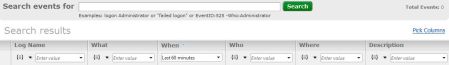 One search tool nicely complements the other – start off by putting any word or phrase you’re looking for in the query box, get the initial results and narrow them down by putting additional criteria in the column filters. For example start your search with “logons”, then pick up the EventID field into the events grid and put in only the eventids of logon events you’re really interested in. Don’t know what eventids to look for?  Find it out in our online event encyclopedia. Shrink the results further down by putting in the logon name of the user the logon events should be attributed to.
